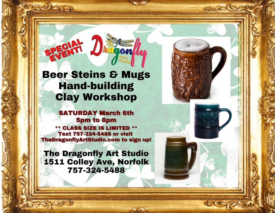 Join us at The Dragonfly for a SPECIAL EVENT – A BEER STEINS AND MUGS clay hand-building workshop in our gallery and studio at 1511 Colley Ave in the heart of Ghent, where you’ll learn the basics of hand-building with clay, and be able to make your own creations to keep for years to come!