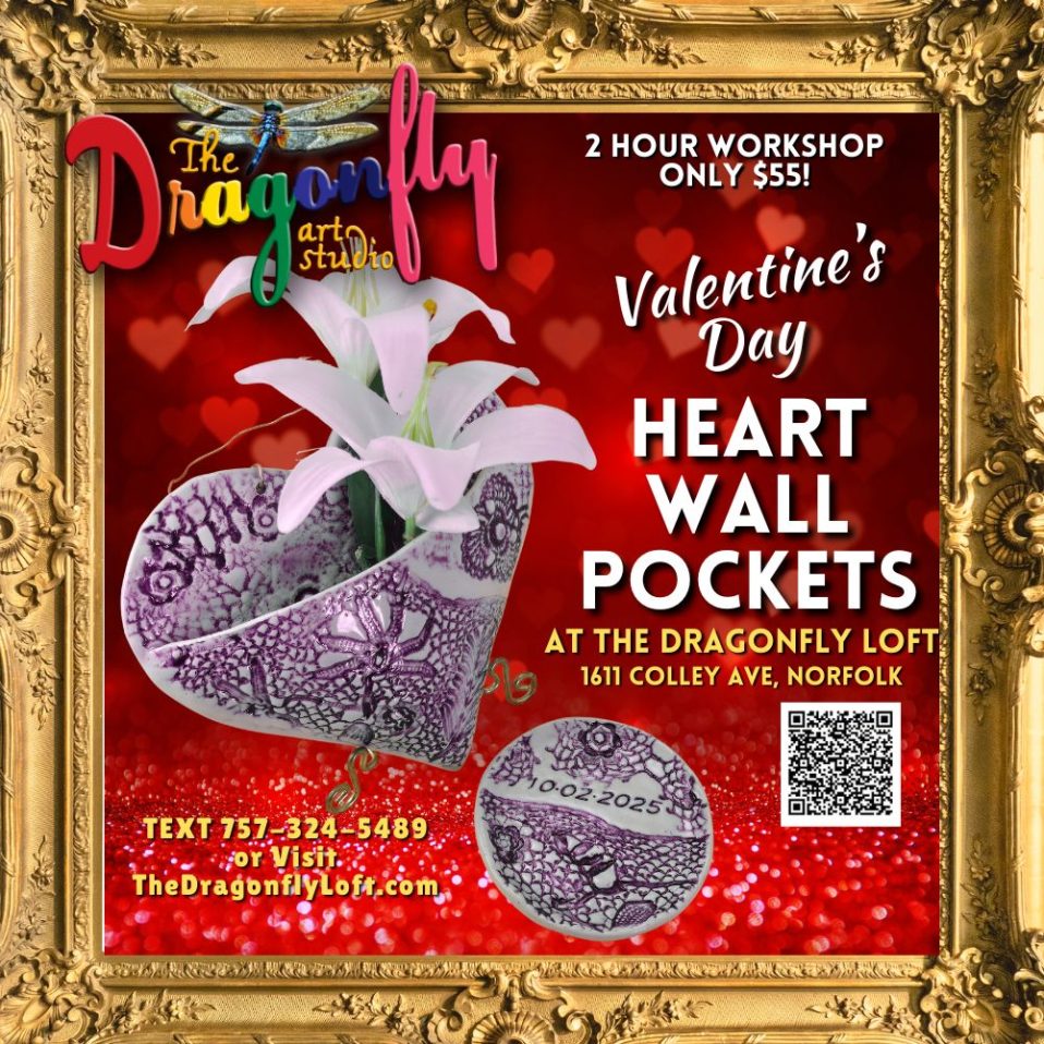 Join us for a special VALENTINE’S DAY workshop at our Dragonfly Loft location! Students will be introduced to the basics of working with and hand-building with clay and will learn basic construction techniques in order to create a unique heart-shaped clay wall pocket plus a bonus trinket dish.