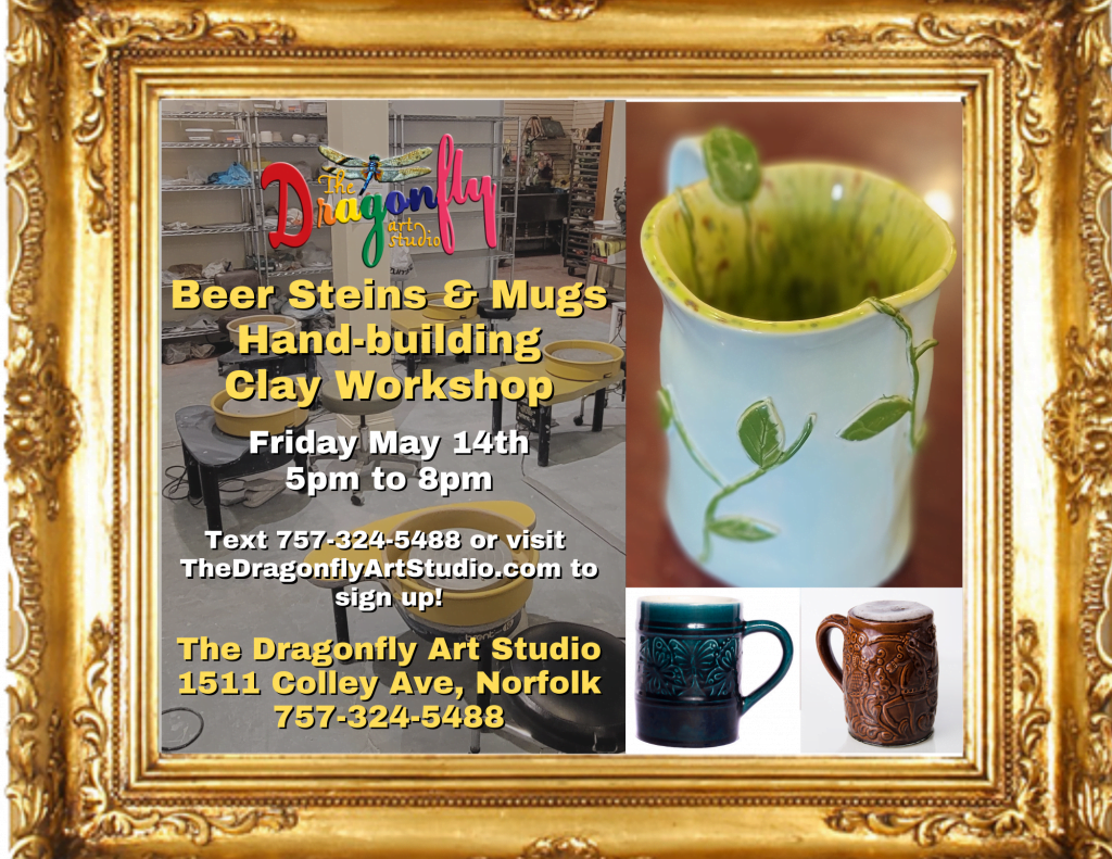 Join us at The Dragonfly for a SPECIAL EVENT – A BEER STEINS AND MUGS clay hand-building workshop in our gallery and studio at 1511 Colley Ave in the heart of Ghent, where you’ll learn the basics of hand-building with clay, and be able to make your own creations to keep for years to come!